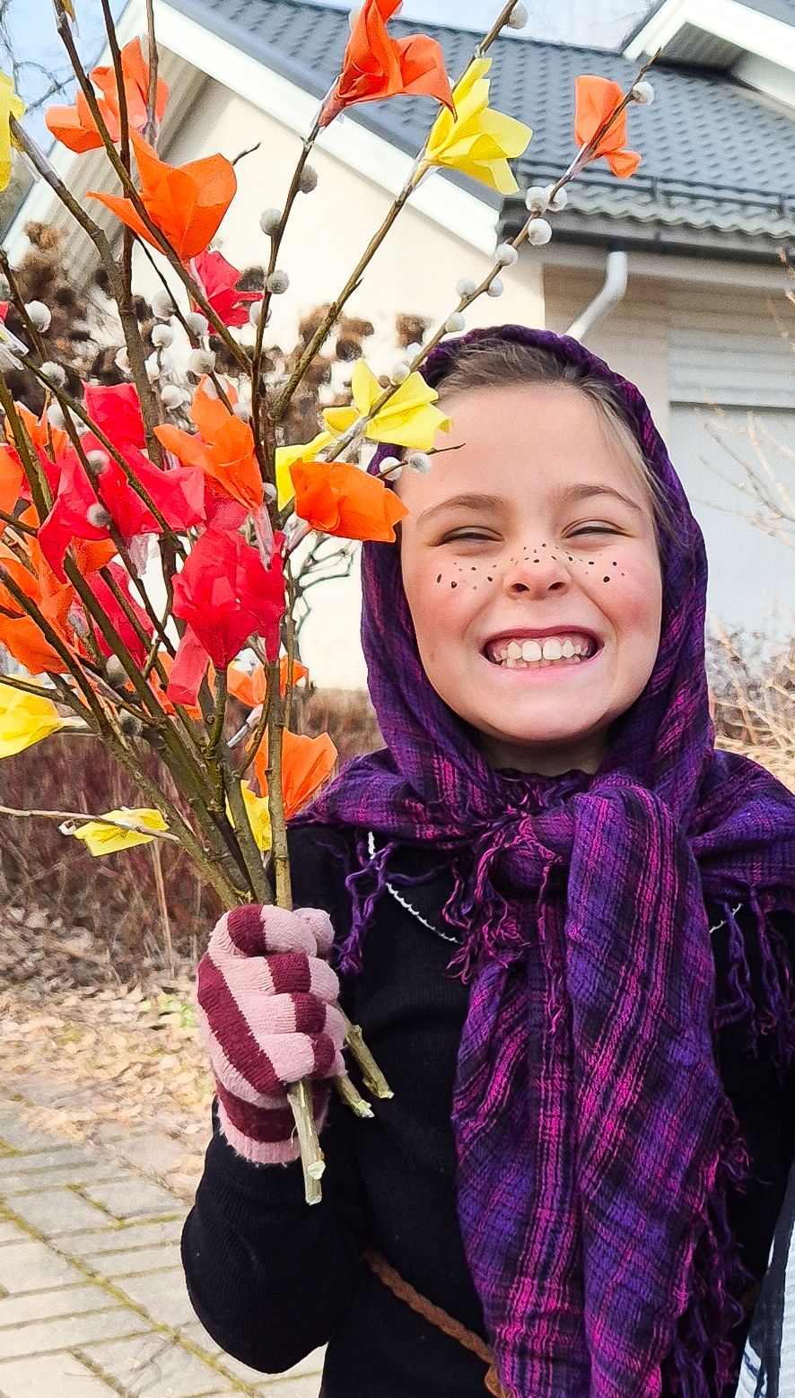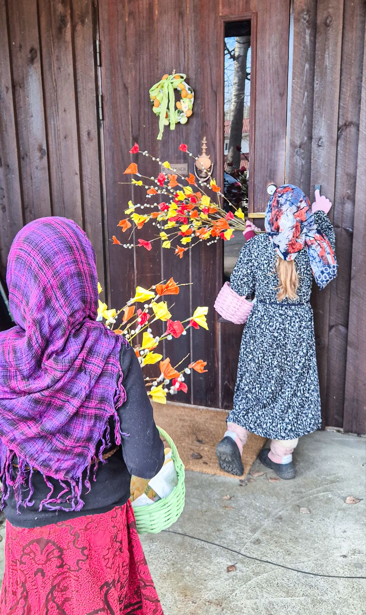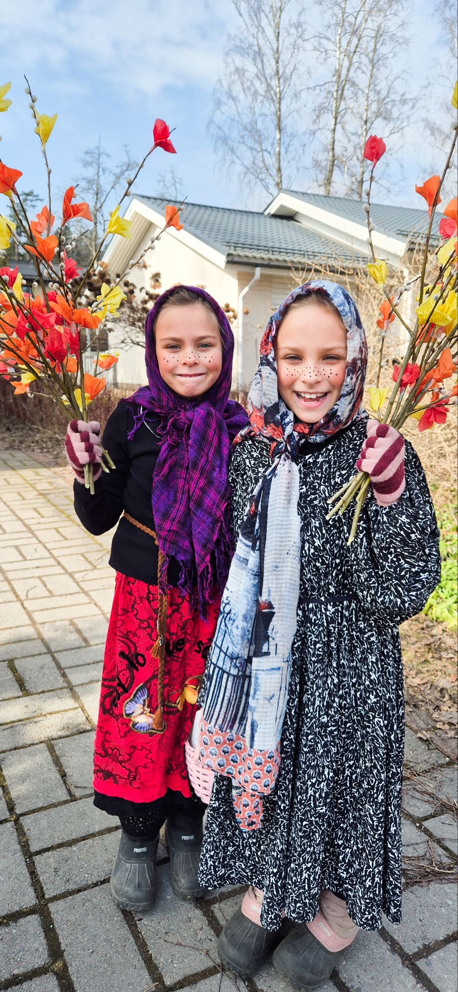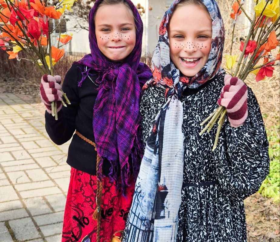 I adore the Finnish tradition of Easter blessings (virpominen). It is such a joyful thing to do. I firmy believe one should make an effort, which is why we take care with both decorating the willow branches, and dressing up as traditional witches. These witches then go from house to house, blessing the home and handing over a decorated branch in exchange for chocolate eggs or other candy.