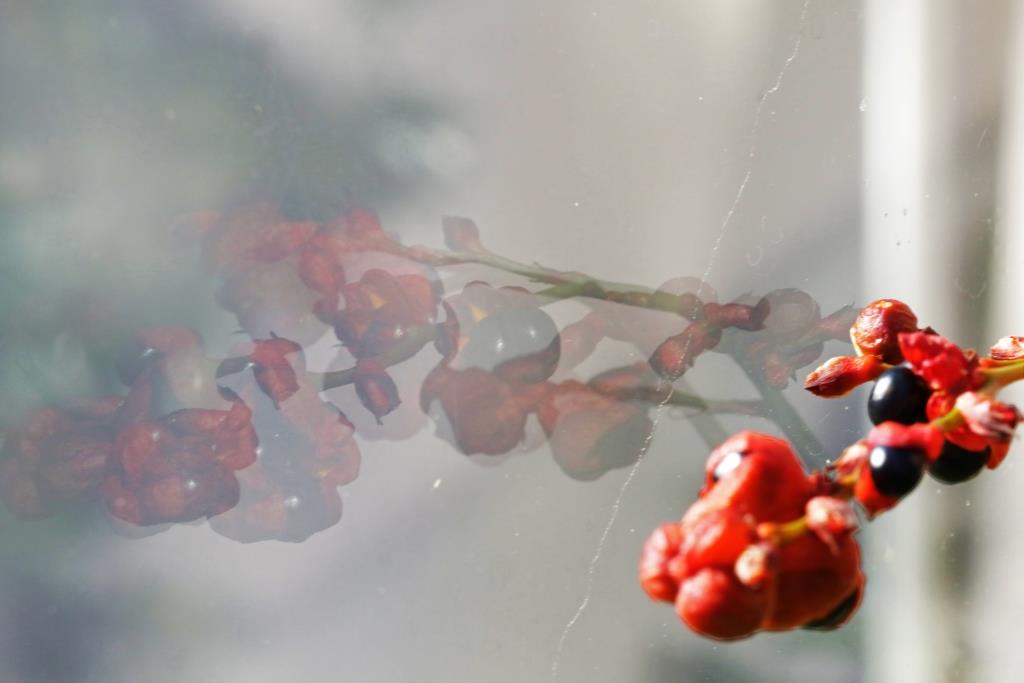 Our garden has embraced the fence, and many flowers lean to it for support, creating nice reflections in the sunshine.